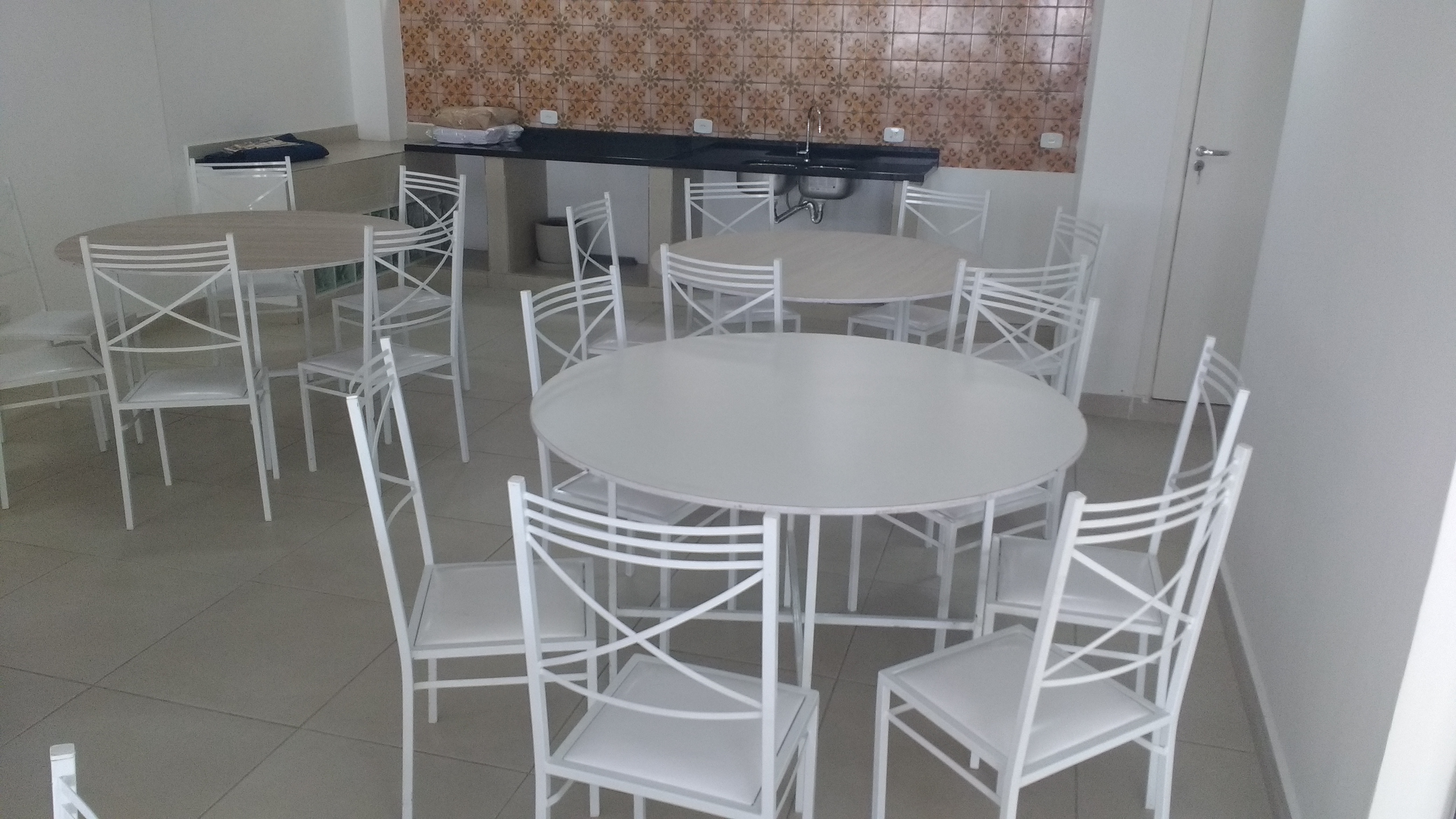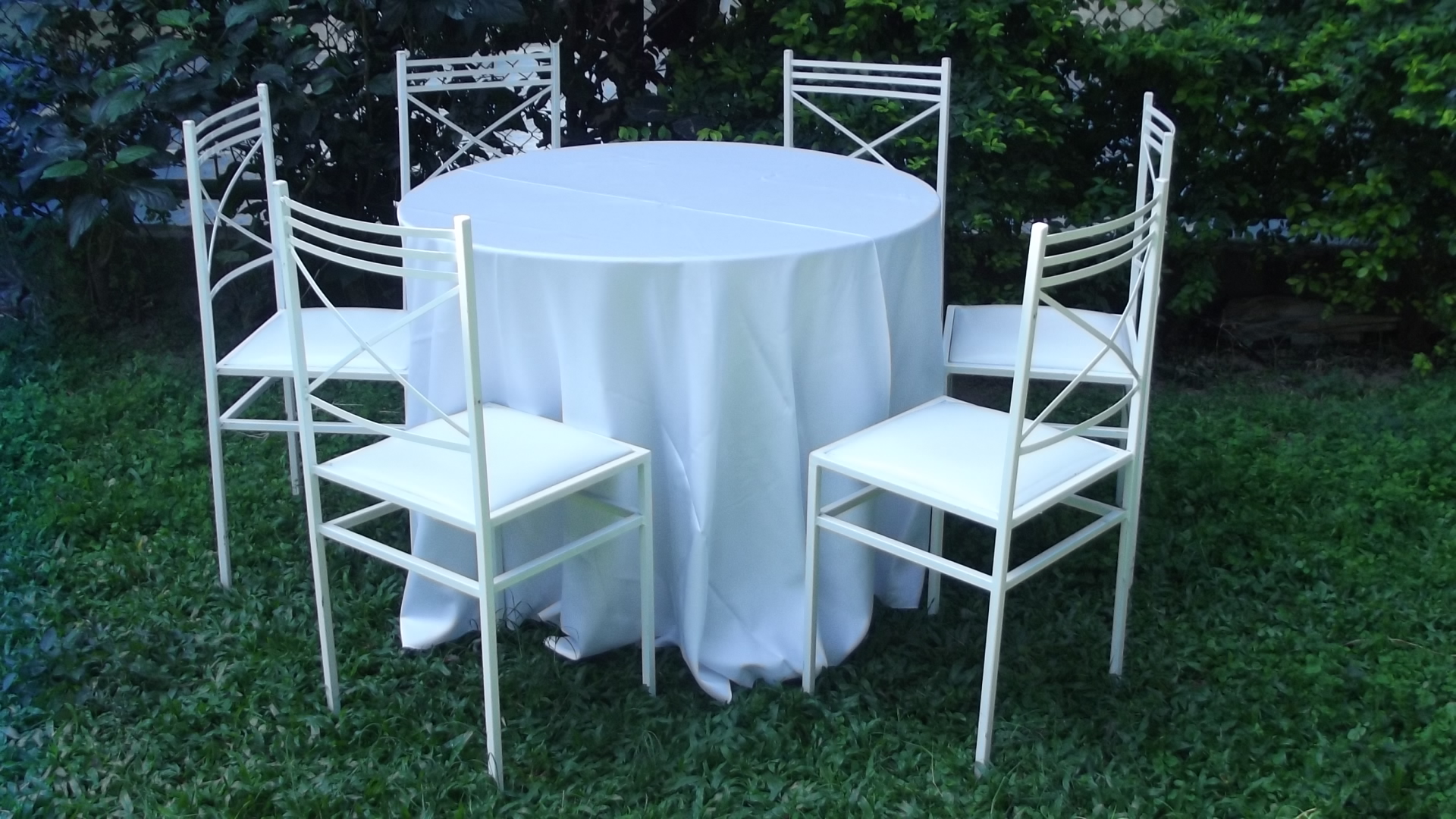 01 MESA REDONDA + 06 CADEIRAS DE FERRO BRANCA + 01 TOALHA BRANCA REDONDA