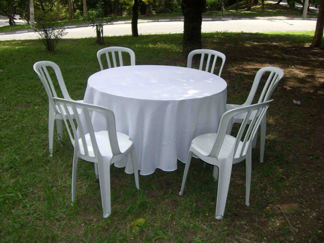 01 MESA REDONDA + 06 CADEIRAS PLÁSTICAS + 01 TOALHA REDONDA BRANCA